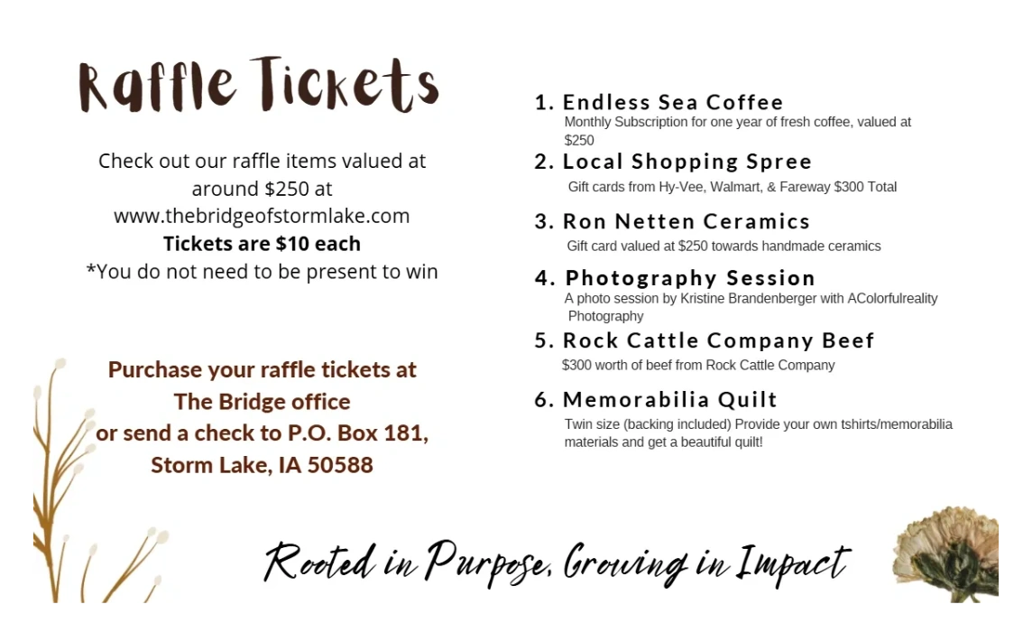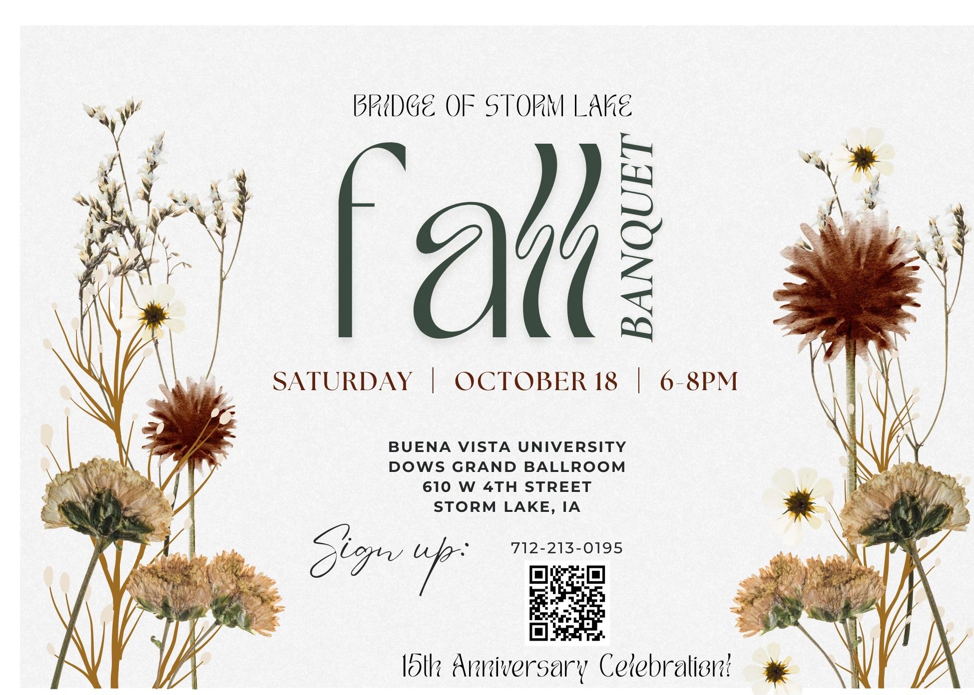 The Bridge of Storm Lake is preparing for its Annual Fall Banquet at BVU on Saturday, October 18th, 2025.