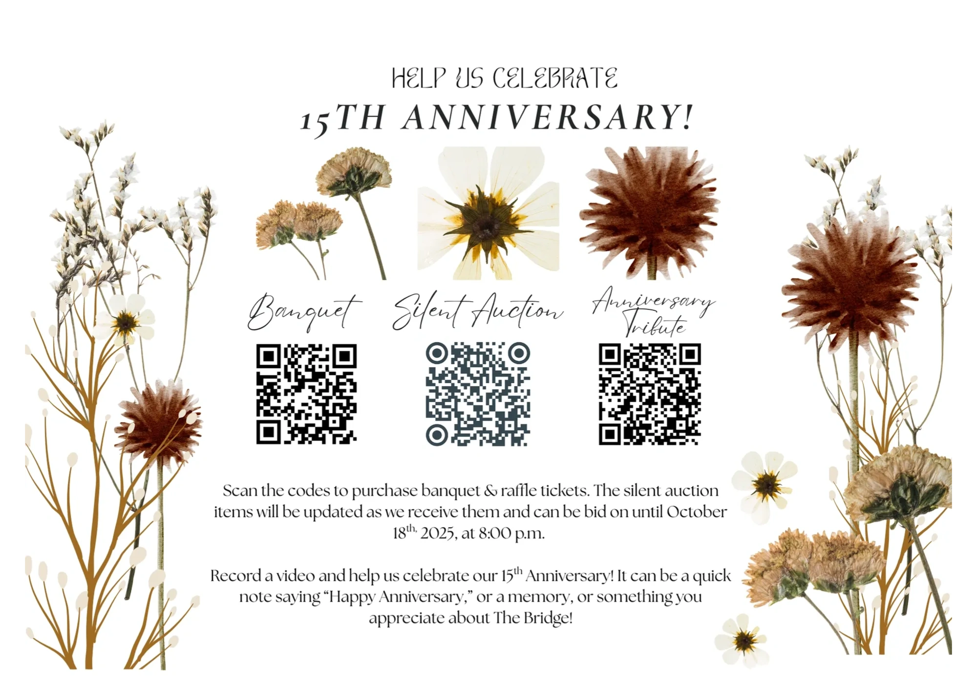 Record a video and help us celebrate our 15th Anniversary! It can be a quick note saying “Happy Anniversary,” a memory, or something you appreciate about The Bridge!